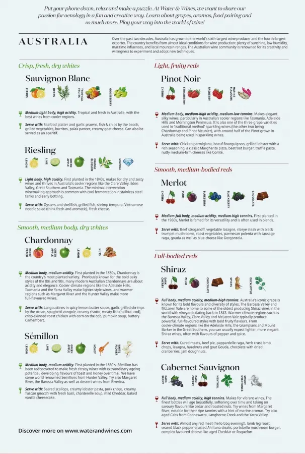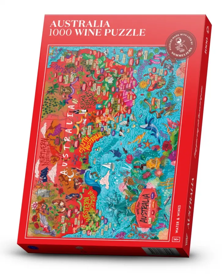 Lär dig om Australiens viner och vinregioner samtidigt som du lägger ett vackert pussel! I pusselkartongen ingår även en poster.