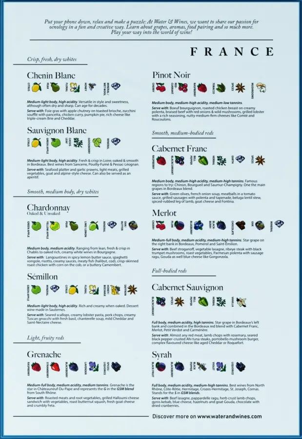 Lär dig om Frankrikes viner och vinregioner samtidigt som du lägger ett vackert pussel! I pusselkartongen ingår även en poster.