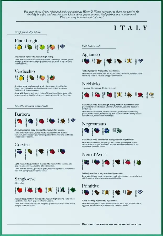 Lär dig om Italiens viner och vinregioner samtidigt som du lägger ett vackert pussel! I pusselkartongen ingår även en poster.
