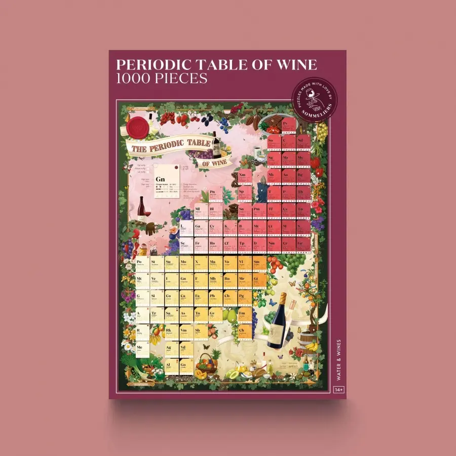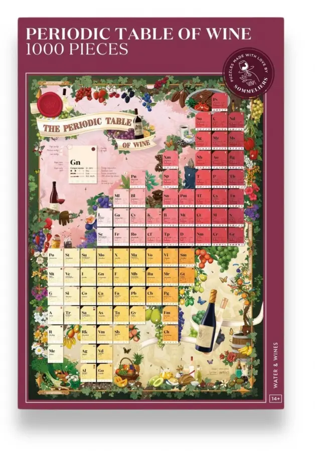 Den perfekta följeslagaren till nästa vinprovningskväll! Det här pusselmotivet guidar dig genom några av världens favoritdruvsorter, organiserade efter kropp och syra i ett handillustrerat periodiskt system. För varje druva beskriver tabellen viktiga egenskaper, ursprung och smaker, vilket hjälper dig att lära dig på ett lekfullt och visuellt sätt.