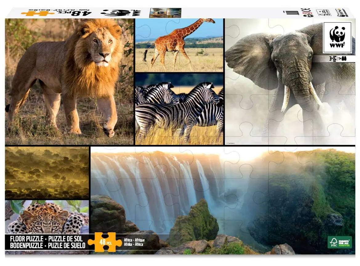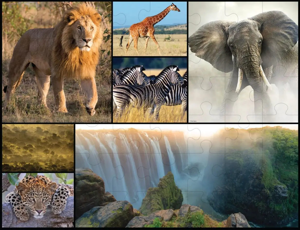 Kollage av Afrikanska djurarter och ett stort vattenfall. Pusslet har extra stora och greppvänliga bitar och går att lägga såväl på ett bord som på golvet.