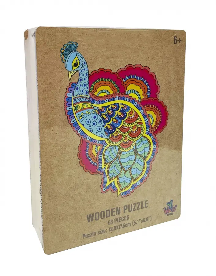 Ett vackert träpussel med en färgglad påfågel. Pusselbitarna har olika former och ger en rolig utmaning för pusslare från 6 år.