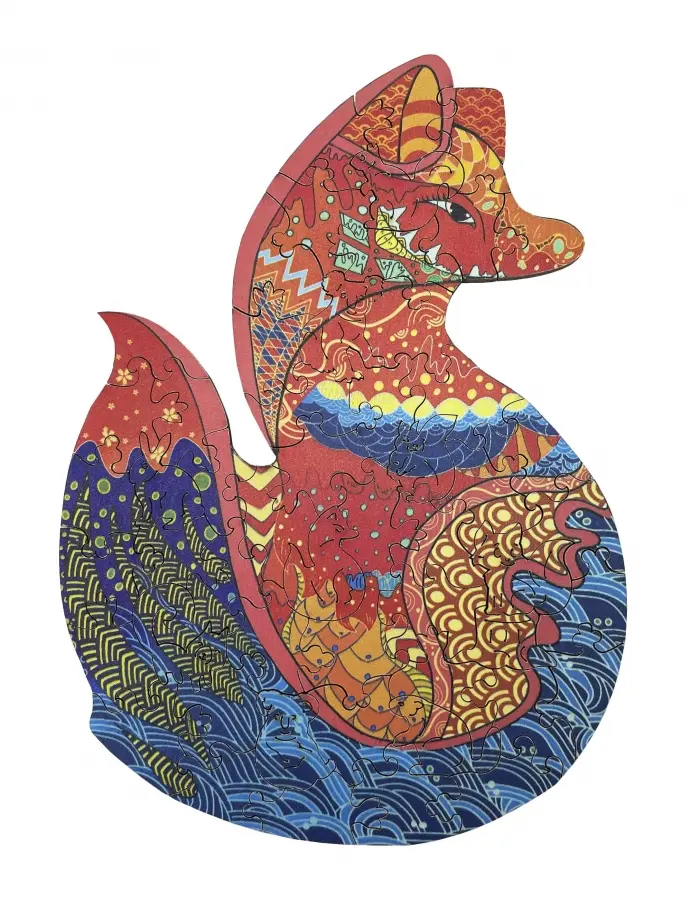 Ett vackert träpussel med en färgstark räv. Pusselbitarna har olika former och några av bitarna är utformade som djur. En rolig utmaning för pusslare från 6 år.