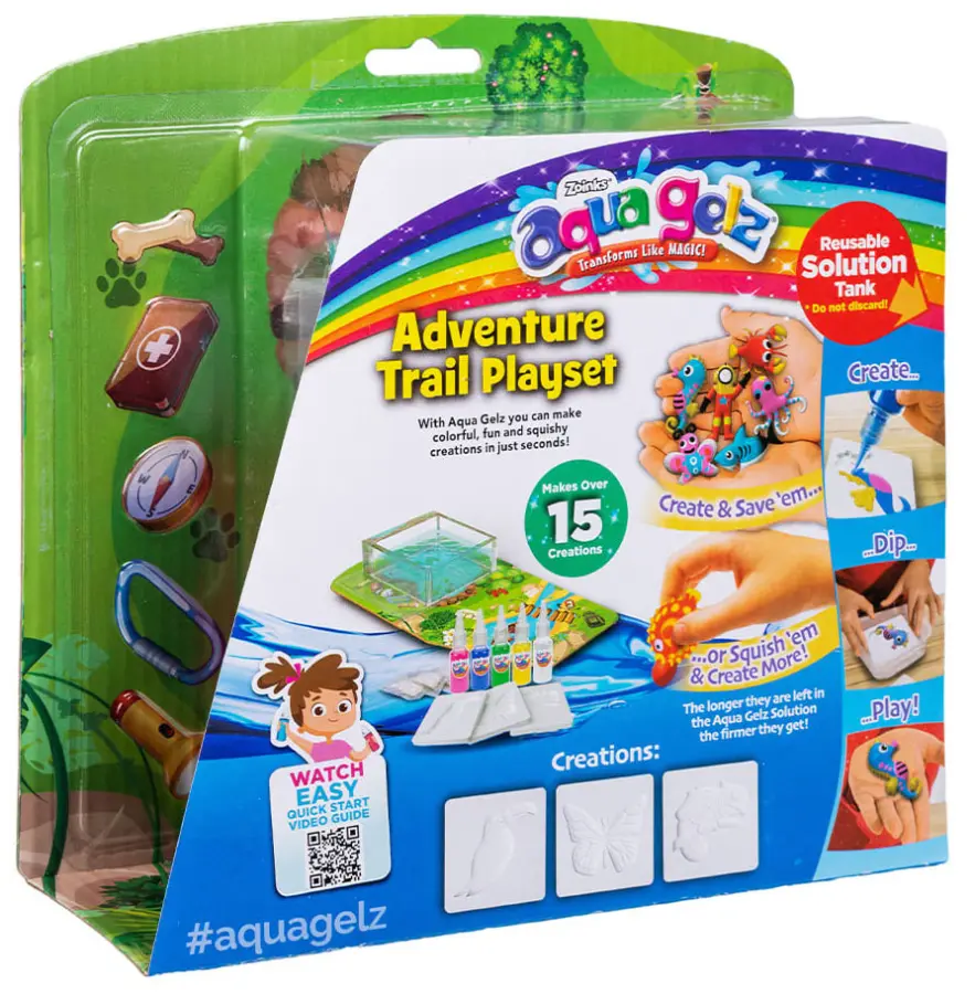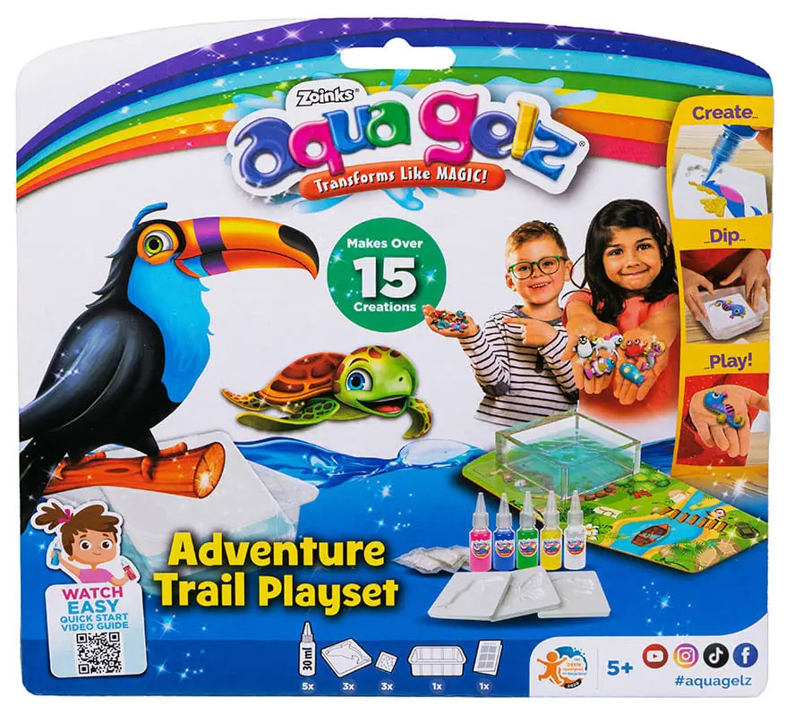 Innehåll: 5 x 30 ml Aqua Gelz-färger, 3 figurformar, 3 x 5 g vattentillsatser, vattenbehållare, instruktioner på svenska, finska, danska, norska, engelska. På insidan av förpackningen finns ett tryck av en kul äventyrsstig, där man kan leka med figurerna.