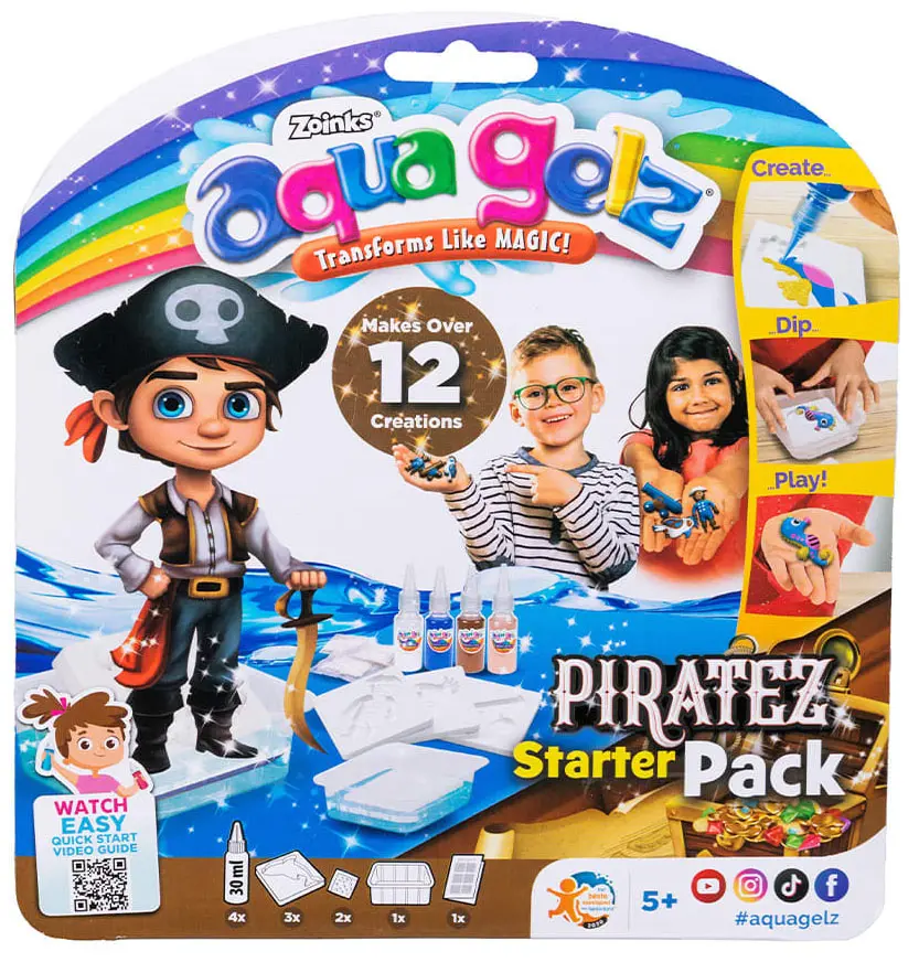 Innehåll: 4 x 30 ml Aqua Gelz-färger, 2 x 5 g vattentillsatser, 3 figurformar med pirat-tema, vattenbehållare, instruktioner på svenska, finska, danska, norska, engelska.