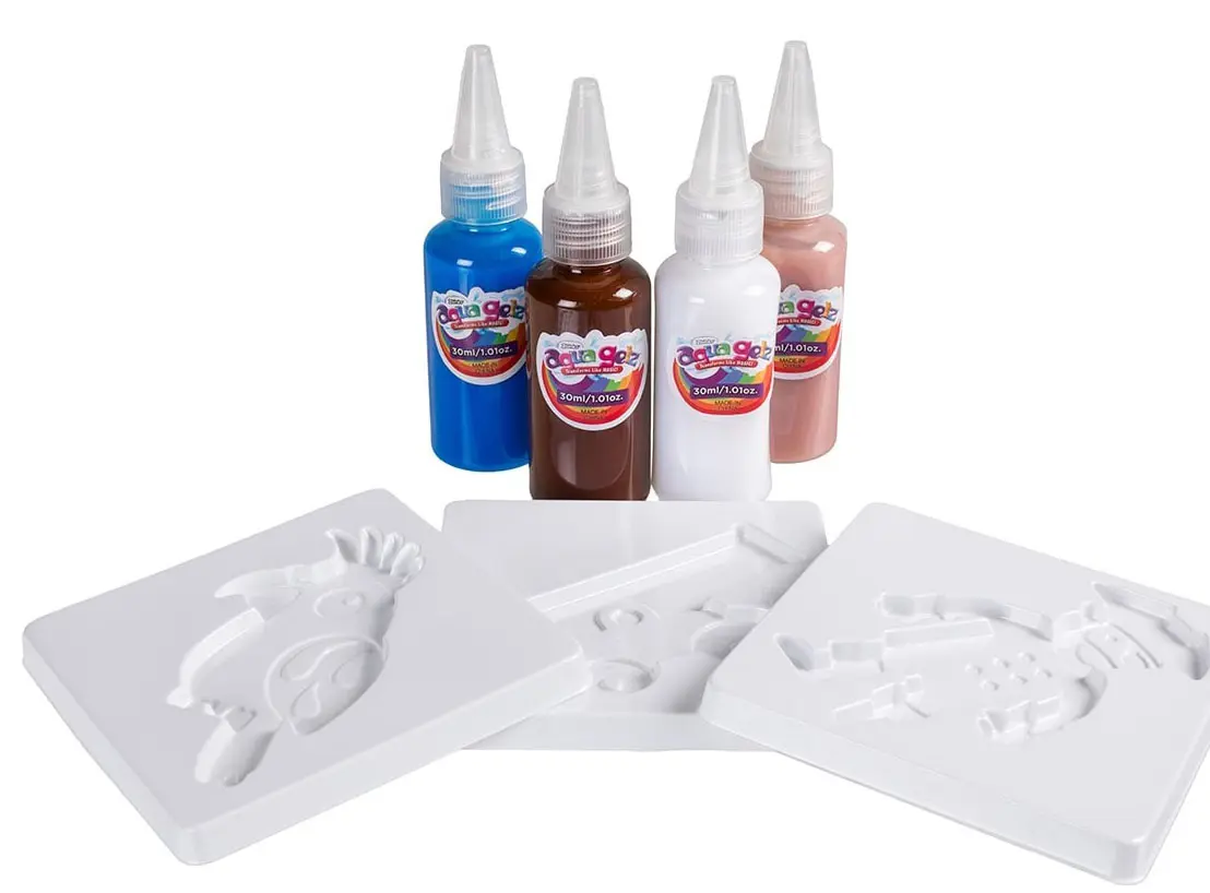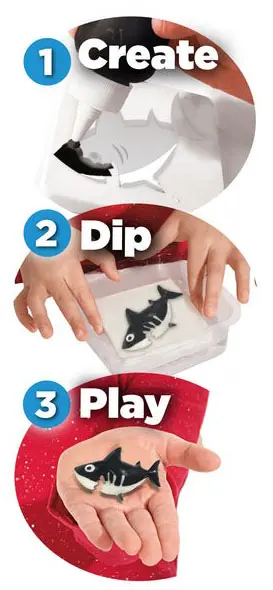 Häll vatten i den medföljande skålen, blanda i en påse vattentillsats och tryck ut Aqua Gelz-färger i en av formarna. Lägg formen i skålen med vattenlösning och se hur figuren förvandlas till 3D-form och lösgör sig ur formen. Låt härda i lösningen i ytterligare 3-5 minuter. När du är klar kan du leka med figurerna.